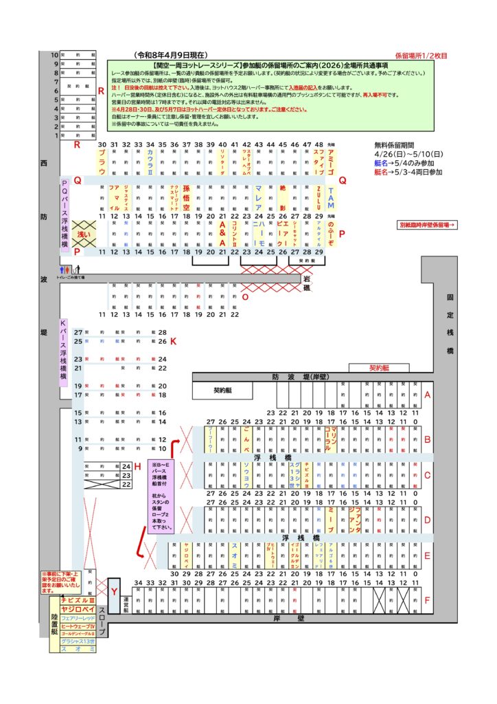 関空一周ヨットレースシリーズ参加艇の係留場所を下記の通りお知らせいたします。 2026関空レース参加艇係留場所一覧1.pdf 2026関空レース参加艇係留場所一覧2.pdf